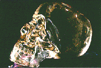 John: It was carved by a contemporary gem carver in Mexico last year in 1995. It was approximately six months of work, working with a fairly fine quality piece of quartz, a piece of quartz almost of the optical standard used in the Mitchell- Hedges Skull. The gem carver apparently is of a long line of gem carvers in his family, if what I am told is correct. His family has been involved with carving from stone various ritual items used by Mayan groups for centuries. He does not use the ancient techniques himself, he uses modern machinery and uses diamond abrasives exclusively to grind and polish the quartz. There was a fair amount of difficulty with this particular carving with the articulating and removable jaw piece. The problems that occurred with this were that the original jaw which was carved from the same piece of quartz as the main body of the skull broke during the final polishing process apparently due to a mistake on the part of the person doing the carving. There was not sufficient quartz left in the original piece of rough quartz to manufacture another jaw piece. It requires quite a large piece of quartz to do this so another similar piece of quartz was used. The piece was used is not of as fine a grade as the piece used in the body of the skull and when I first saw this skull in Denver at a large international mineral show there in September of last year. My first comment was that it was a wonderful piece of work but that the jaw didn't look correct because it was of a different standard of clarity. That was the last I saw of that skull until February of this year, 1996, where it was one of the major display items at the International Mineral and Gemstone Show in Tucson, Arizona. It was displayed in a locked case in the lobby of the Pueblo Inn Hotel and attracted wide public attention.